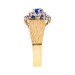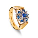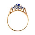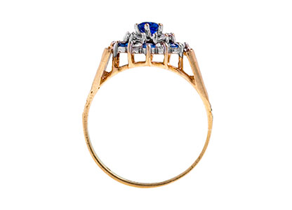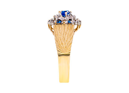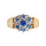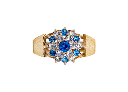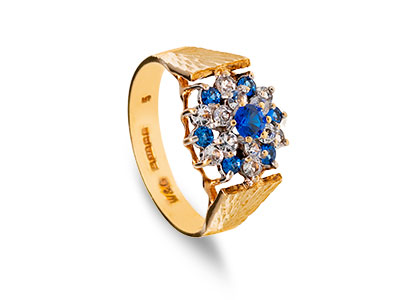 A gorgeous 9ct yellow gold ring, set with seven blue and twelve white round stones in a traditional claw setting, with a beautiful sunburst diamond cut pattern to both side shoulders.