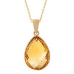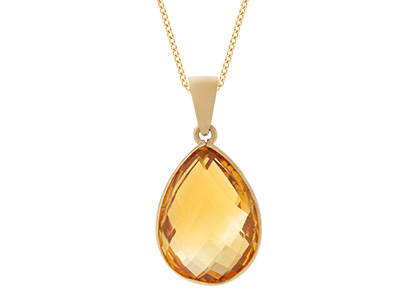 This larger than average double cut pear shape golden citrine pendant is crafted in 9ct yellow gold, it has the same facets on the back as the front, so it can be worn with confidence, in the comfort that it will always look great, no matter which way round you wear it.