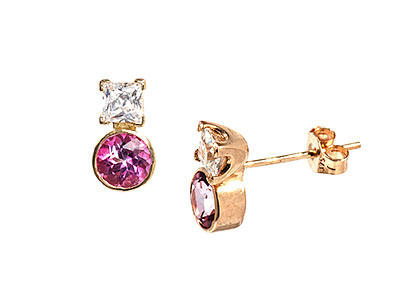 Why not be a trend setter with this unusual creative combination of a real round brilliant cut pink topaz and a contrasting white square sparkling cubic zirconia, set into 9ct yellow gold stud earrings.