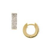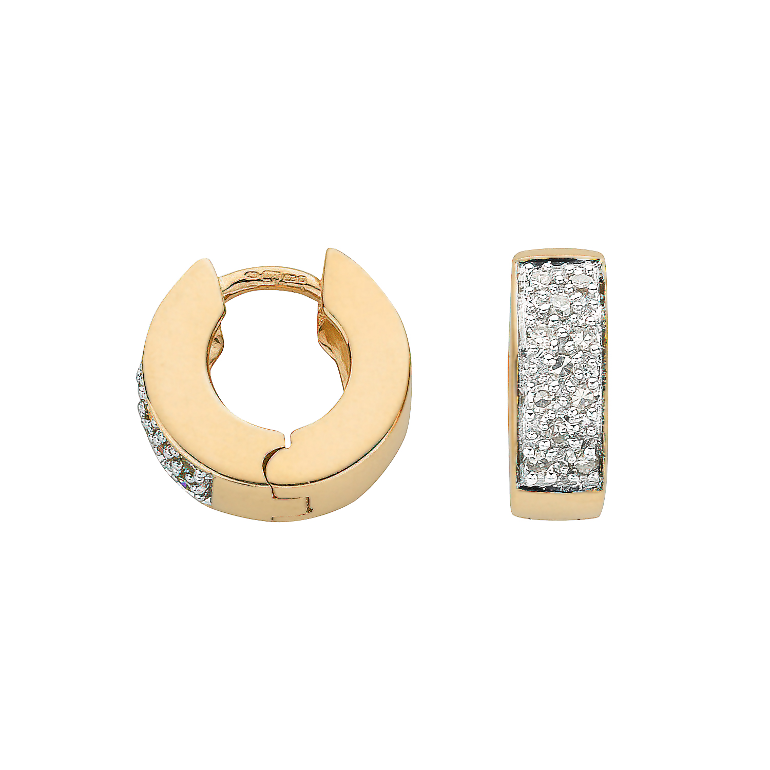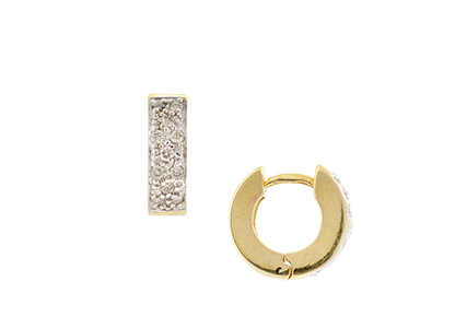 An unusual small chunky huggie style loop earrings, fashioned in 9ct polished yellow gold and encrusted to the front with glittering round white diamonds, adding an instant eye catching sparkle to your look reflecting their brilliant light and fire in every direction that will ensure you steal the spotlight. I am sure these splendid earrings will become an all time favourite, that you will want to wear as often as possible, taking you from day to night with ease.