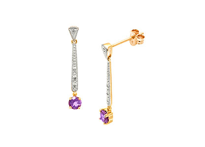 This beautiful pair of 9ct yellow gold drop earrings are made in two moving sections, featuring a triangular fan shape top set with a single round diamond and connected to a slim suspended tapered bar set with a further three diamonds, all with a white rhodium top and a mill grain setting edge giving a gorgeous antique look. Attached at the base is a beautiful round purple amethyst stone.