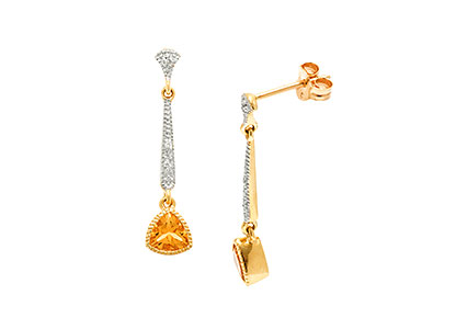 This beautiful pair of 9ct yellow gold drop earrings are made in two moving sections, featuring a triangular fan shape top set with a single round diamond and connected to a slim suspended tapered bar set with a further three diamonds, all with a white rhodium top and a mill grain setting edge giving a gorgeous antique look. Attached at the base is a beautiful triangular golden citrine stone.