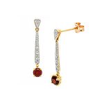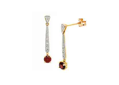 This beautiful pair of 9ct yellow gold drop earrings are made in three moving sections, featuring a triangular fan shape top set with a single round diamond and connected to a slim suspended tapered bar set with a further three diamonds, total diamond weight – 0.02ct. all with a white rhodium top and a mill grain setting edge giving a gorgeous antique look. Attached at the base is a beautiful round 4mm blood red Mozambique garnet stone.