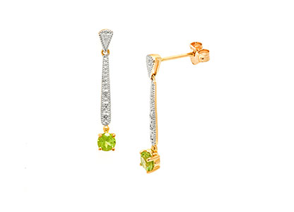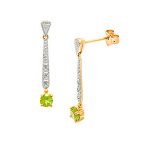 This beautiful pair of 9ct yellow gold drop earrings are made in two moving sections, featuring a triangular fan shape top set with a single round diamond and connected to a slim suspended tapered bar set with a further three diamonds, all with a white rhodium top and a mill grain setting edge giving a gorgeous antique look. Attached at the base is a beautiful round apple green peridot stone.