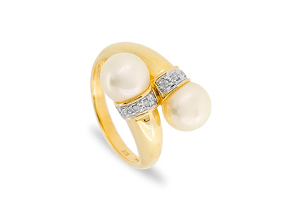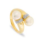 The unusual innovative design of cross over pearls make this ring look absolutely gorgeous, with the contrast of sparkling white diamonds and the silky sheen of the white cultured pearls create a sophisticated combination, perfect to wear for any occasion.