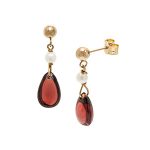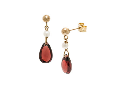 Starting at the top is a 4mm 9ct yellow gold ball stud fitting, following down to a round cultured pearl and then to a beautiful blood red teardrop Mozambique garnet which has a smooth cabochon cut on both sides.