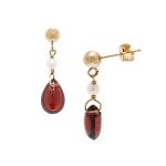 Starting at the top is a 4mm 9ct yellow gold ball stud fitting, following down to a round cultured pearl and then to a beautiful 9mm x 6mm blood red teardrop Mozambique garnet which has a smooth cabochon cut on both sides.