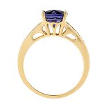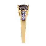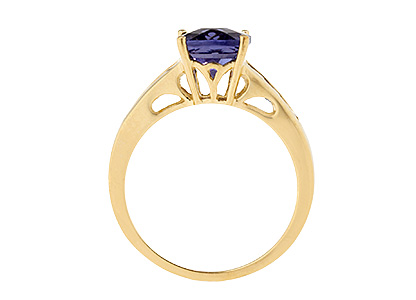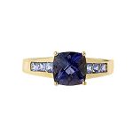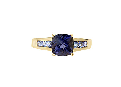 This beautiful ring has a checker, cushion-cut Iolite stone in the centre and three square stones on each of the side shoulders.
