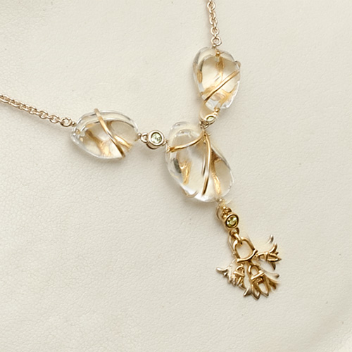 Moonstone a mystical clear smooth blueish white colour, with a lustrous tactile feel and a shimmering opalescent look, it delivers awe and wonder with every glance. With three round very light green contrasting peridot stones. This unusual necklace is sure to be a talking point that will attract admiring comments.