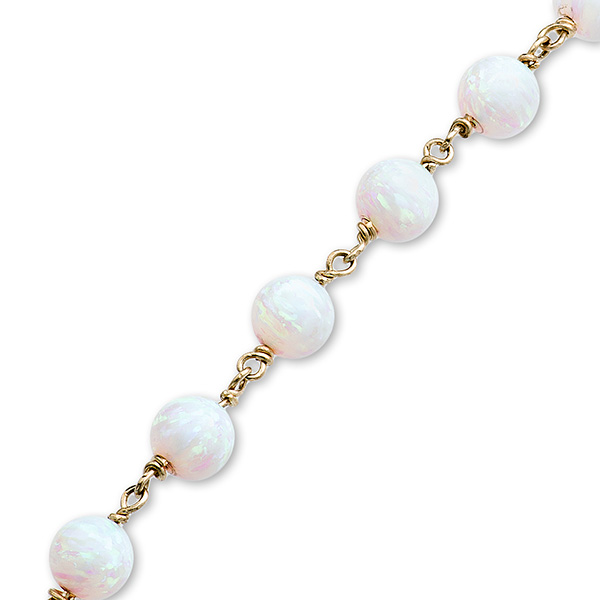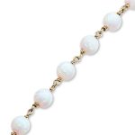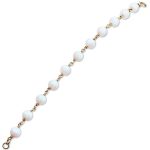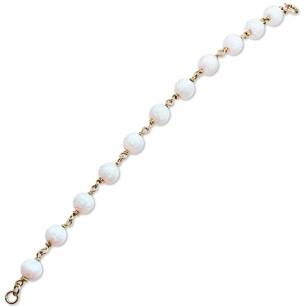 A hand made bracelet with eleven beautiful 8mm oplex beads. A lively rainbow fusion of mainly green and blue with hints of pink and purple, held together with hand crafted solid 9ct yellow gold wire and a bolt ring style clasp.