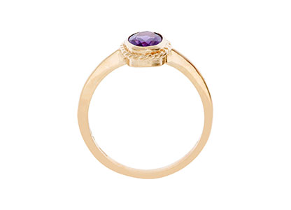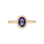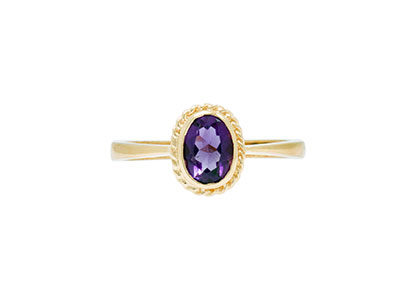 A classic elegant design with a timeless appeal. This yellow gold ring has a gorgeous royal purple oval brilliant cut amethyst in a classic rub over setting enhanced with a twisted wire cord surround.