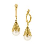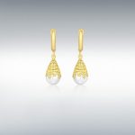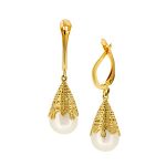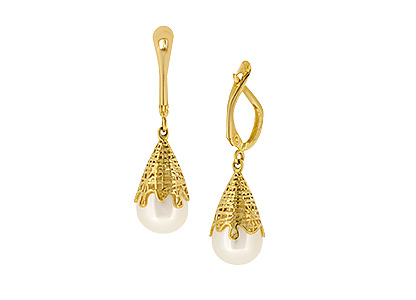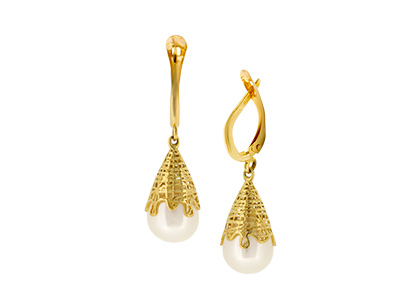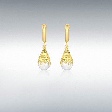 Compelling and luxurious, these delightful 3D bomb drop earrings are intricately pierced all the way around, with an unusual abstract sugar spun basket style pattern surrounding a majestic unblemished smooth glistening white freshwater cultured pearl, crafted in polished 9ct yellow gold. A must-have addition to any jewellery collection that will transform both your working and weekend looks, making sure you look your best whatever time of day or night.