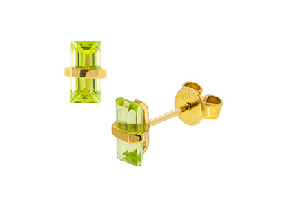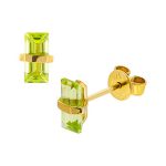 Simply beautiful, these rectangular baguette shaped light olive green Peridot stud earrings create a look that is elegant and graceful. Each stone is wrapped with a single band of yellow gold, giving a dainty feminine look.