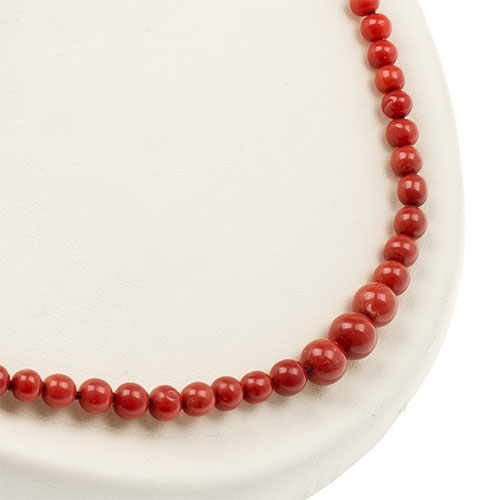 This gorgeous salmon red, coral bead necklace, graduates from 8mm center to 4mm, and is fitted with a 9ct yellow gold adjustable clasp, from 19inches/48.26cm to 20inches/50.8cm.