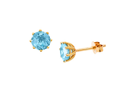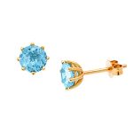 These pretty round brilliant cut blue topaz earrings, are mounted in a 9ct yellow gold domed basket setting with eight claws to show the beauty of the stones to their best advantage.