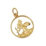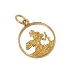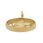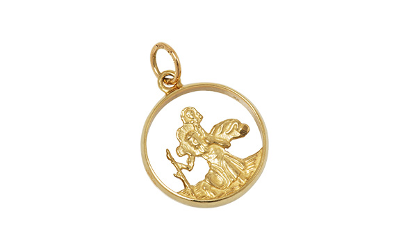 This heavy cast 9ct yellow gold saint Christopher pendant, has a distinctive cut-out design inset into a solid D shape border, making it ideal to use on a heavy neck chain, or hang from a key fob for the keys to the car, boat, or plane, if your lucky enough to have one.