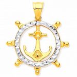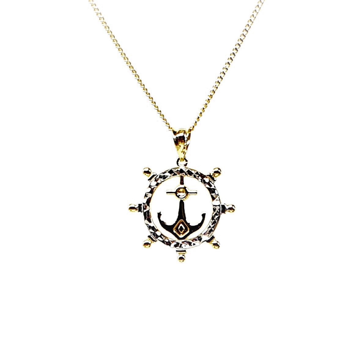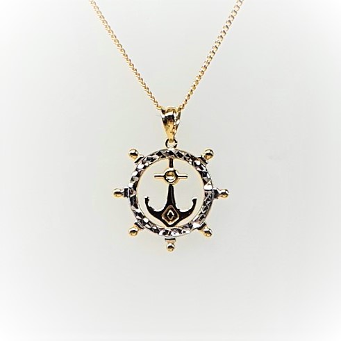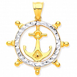 This unusual nautical-themed ship wheel pendant is crafted in solid 9ct yellow gold encircled with a diamond cut pattern overlaid with a white rhodium finish for extra sparkle.