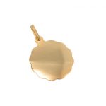 "Round 9ct yellow gold Saint Christopher pendant, weighing approximately 8.6 grams. The pendant measures 27.7mm in diameter and 1.9mm thick, with a length of 39mm, including the two jump rings."