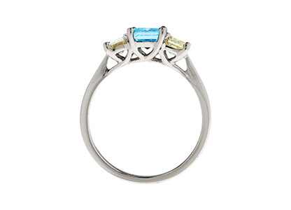 The name Aquamarine comes from the Latin for seawater, it is said to calm waves and keep sailors safe at sea. Aquamarine is the birthstone for March and for the nineteenth wedding anniversary and is said to enhance the happiness of marriages. The best Aquamarine gemstones such as this 3-Stone Aquamarine Diamond Ring combine high clarity with limpid transparency and blue to slightly greenish blue hues. Like many beryl’s, aquamarine forms large crystals suitable for sizable fashioned gems and carvings.