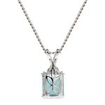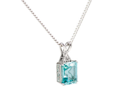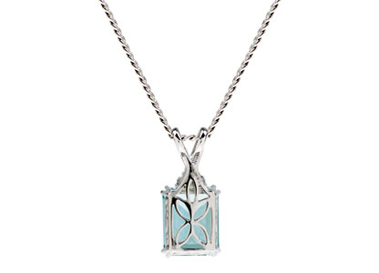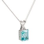This gorgeous 18ct white gold pendant will add a touch of class to your outfit, with the dramatic and eye catching contrast of this large octagonal step cut, cool blue aquamarine stone, topped with three sparkling white round diamonds.