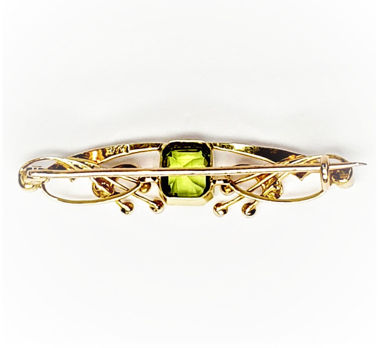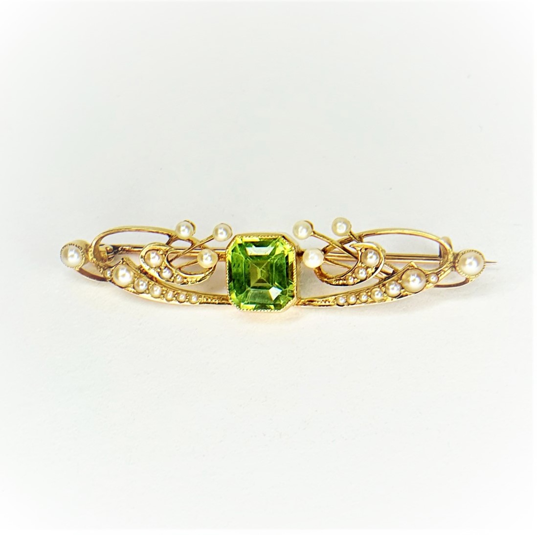 City of London jewellers present this gorgeous Edwardian Art-Nouveau Peridot & Pearl Brooch.