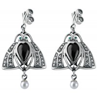 These beautiful handmade drop earrings are crafted from hallmarked sterling silver, and takes inspiration from the work of artists such as Rene Lalique from the Art Nouveau period. Set with emeralds for the eyes, the wings have been encrusted with marcasite. Central to the earring is a heart shaped onyx stone and at the bottom it is finished with a cultured pearl drop. An individual work of art, these highly collectible earrings would make an ideal present for a loved one.