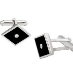 DIAMOND SHAPED CUFFLINKS MADE IN 925 REAL STERLING SILVER INLAID WITH BLACK ENAMEL AND A SINGLE WHITE CUBIC ZIRCONIA TO THE CENTRE.