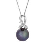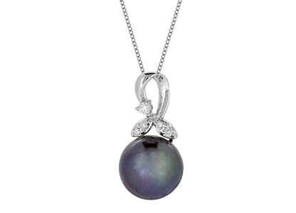 A fabulous 18ct white gold diamond and black cultured pearl pendant and chain. The loop of the pendant incorporates five sparkling diamonds to make a stalk and leaf effect, giving this pendant a beautiful flowering appearance.