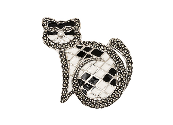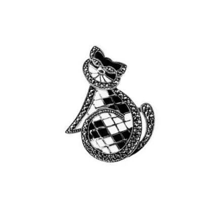 Adorned with real marcasite stones and black and white enamel, it’s a perfect accessory for cat lovers and fashion enthusiasts alike, offering a blend of elegance and charm.