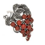 Beautifully detailed grape leaves inlaid with real marcasite stones and a cluster of red agate stones cascade down to form this gorgeous bunch of grapes a design reminiscing the designs of the Victorian era.