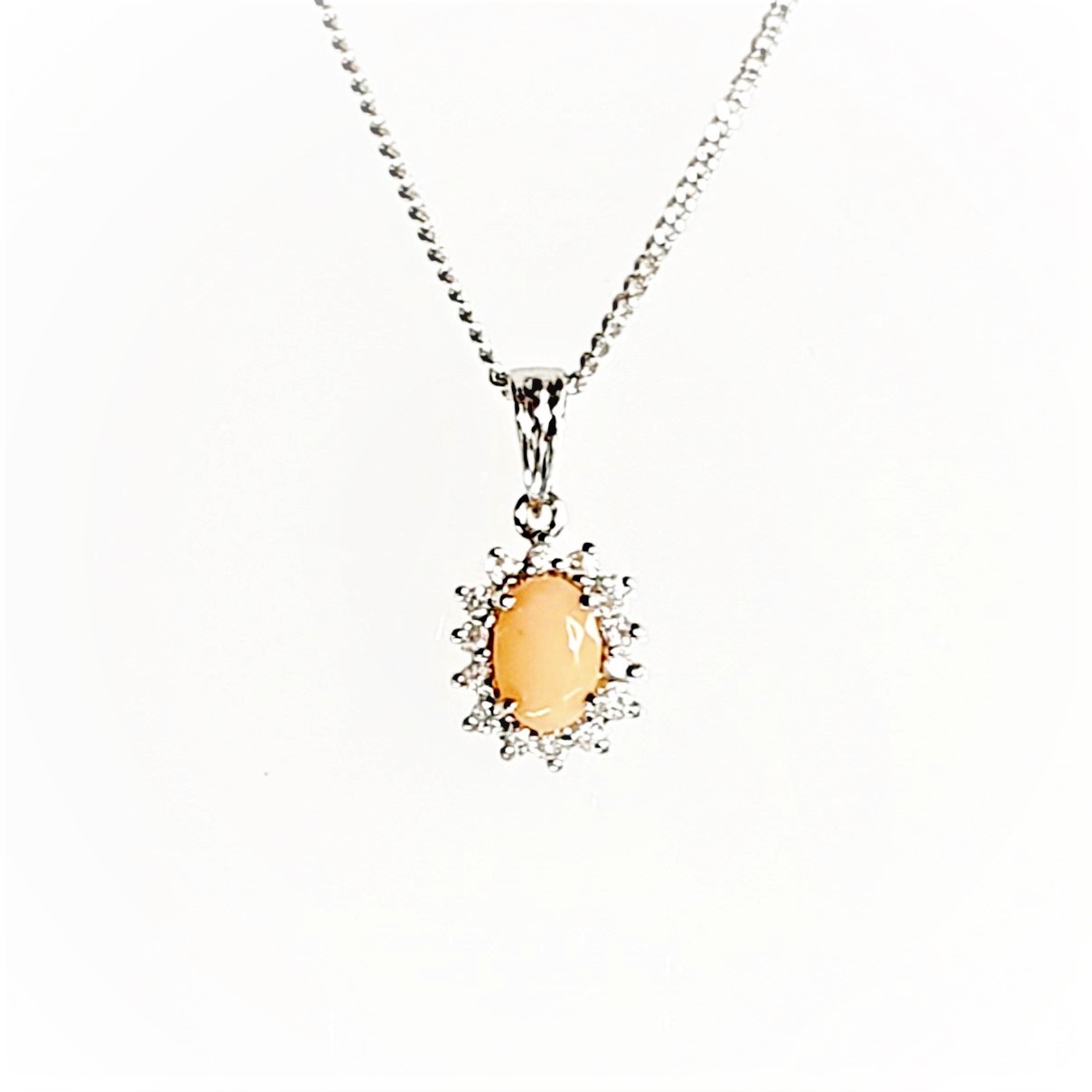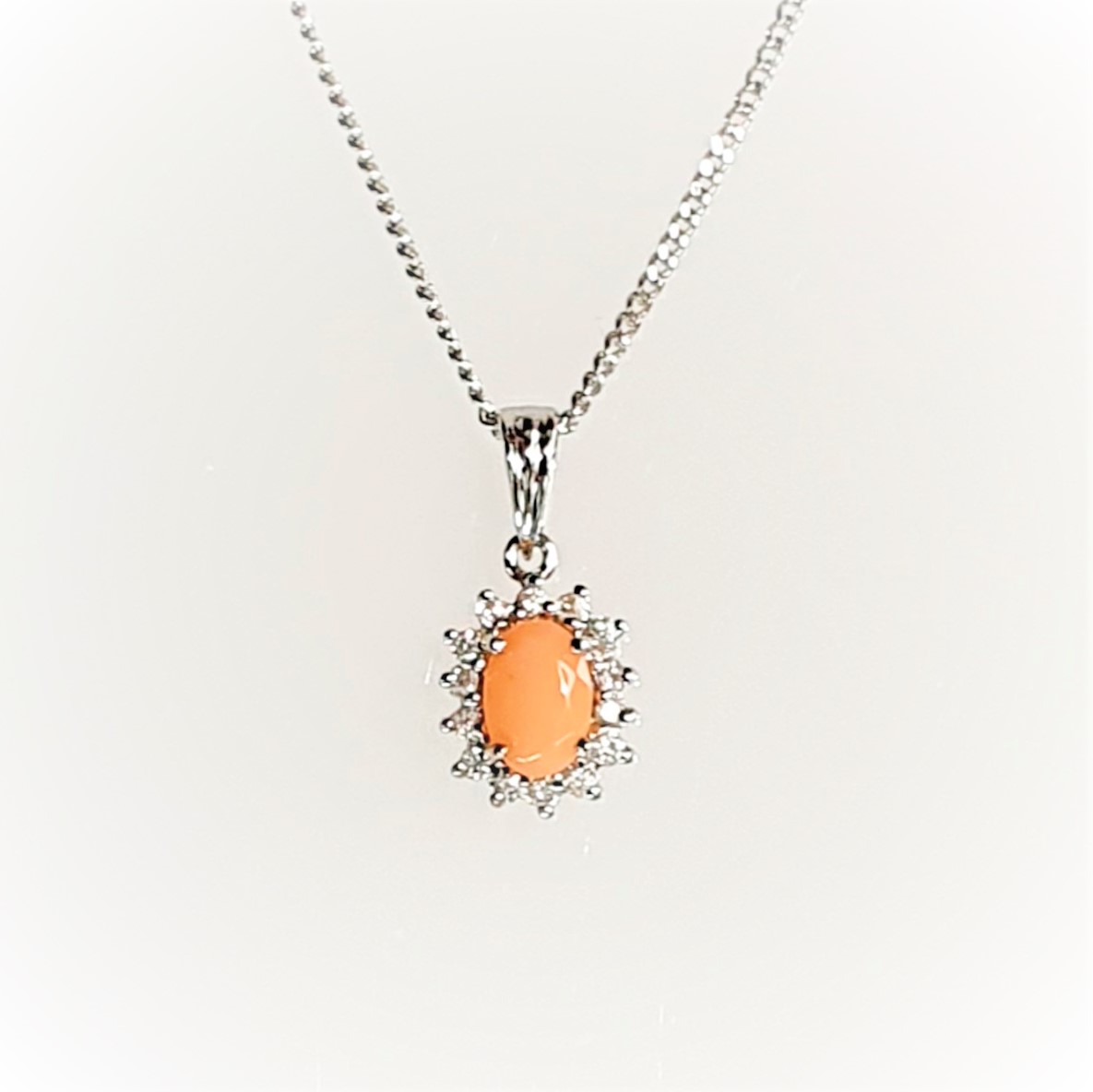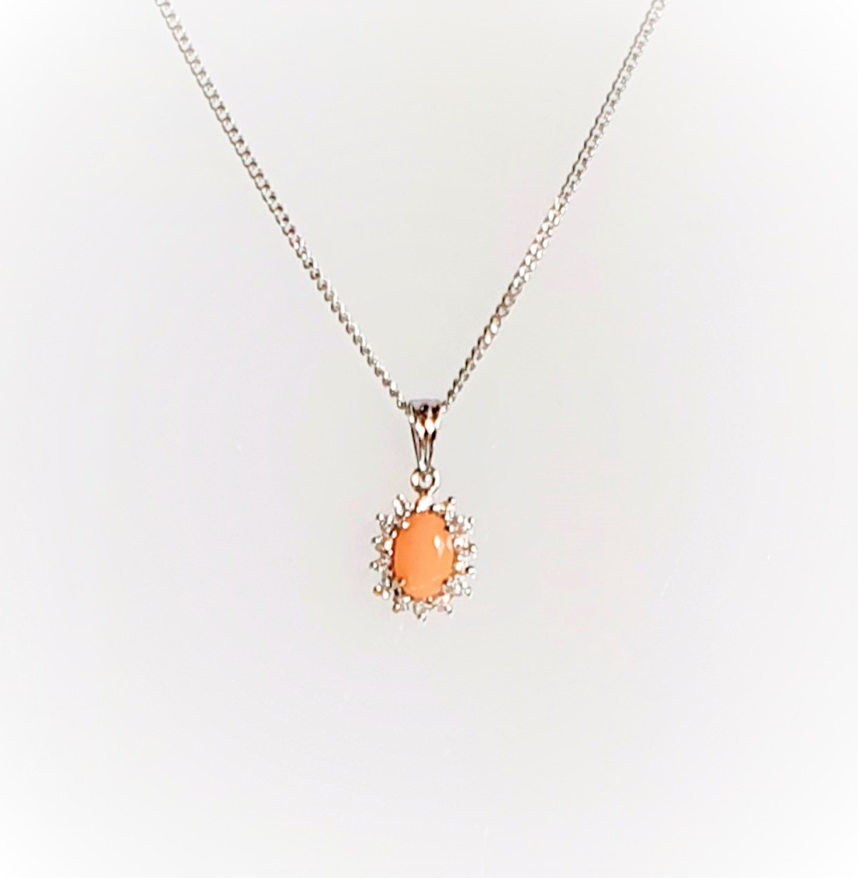 A delightful classic oval pink coral & diamond cluster pendant elegant and intricately crafted to the highest standard in 9ct white gold, creating a smart and sophisticated style that she will always cherish.