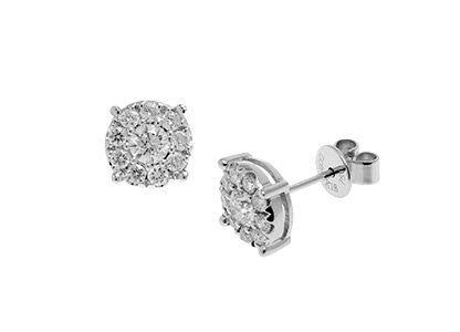Simply stunning, these beautiful 18ct white gold diamond stud earrings are elegant and intricately crafted. The round shaped white gold cluster settings have a single centre diamond in an invisible setting, surrounded by nine round brilliant cut claw set diamonds, this gives an illusion of one 1.75ct diamond in each earring which creates a dazzling display of sparkling fire.