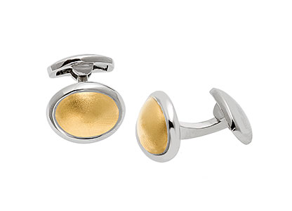 This gorgeous, sophisticated, curved and domed, oval unisex cufflink, has a high polished edge inlaid with a contrasting brushed matt 18ct yellow vermeil centre to the front. Quality that speaks for itself, a truly exquisite link.