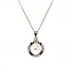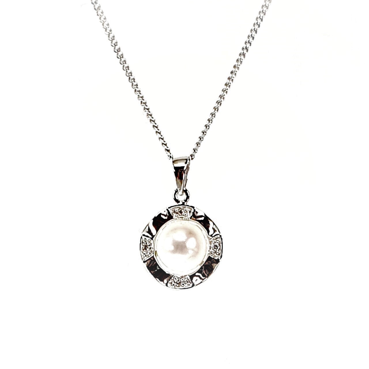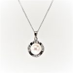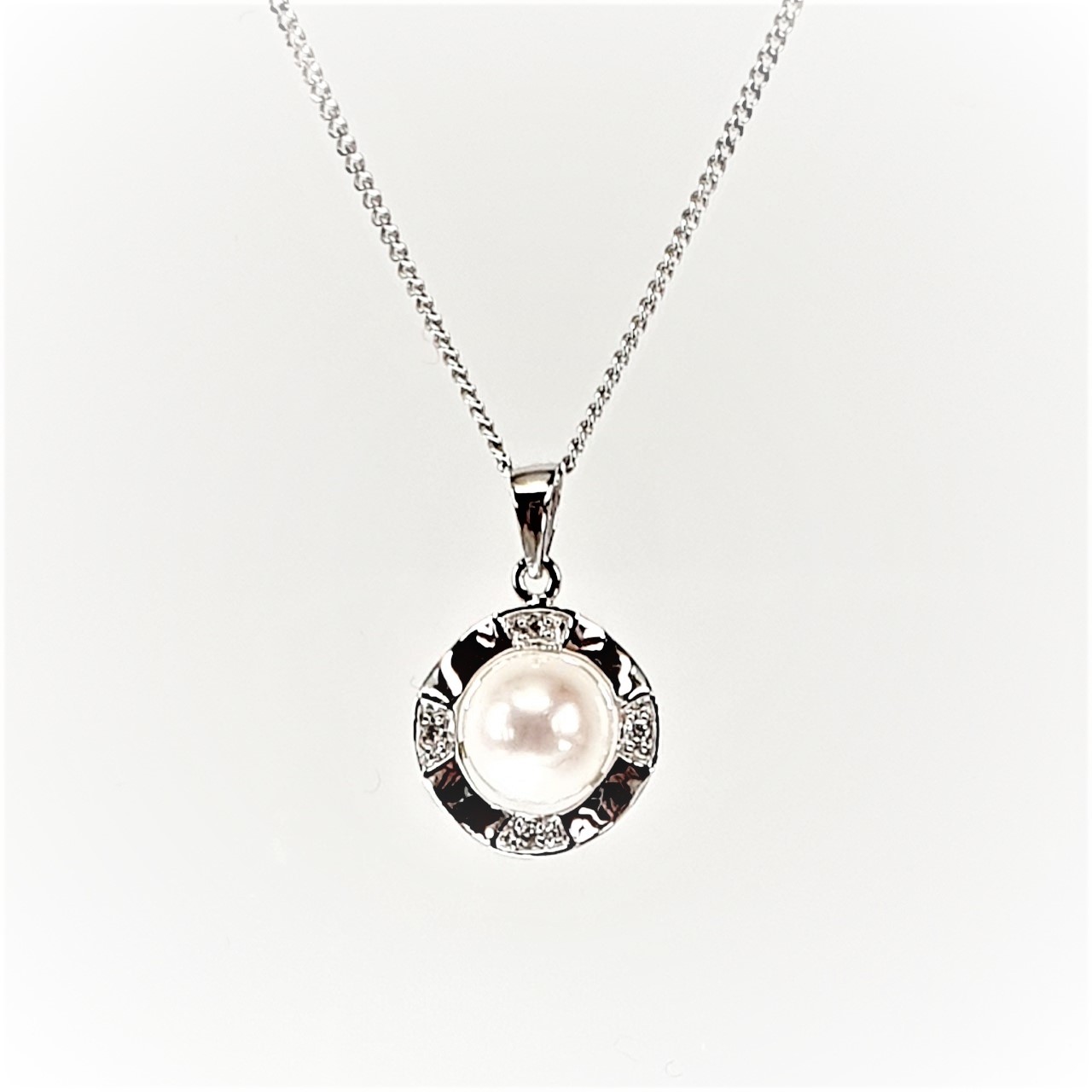 This beautiful shimmering 7mm white cultured pearl is encompassed with a wave of white gold set with four equally spaced sparkling white diamonds, an unusual design that will add a glamourous look to any outfit.