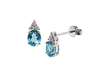 Simply stunning, these beautiful 18ct white gold stud earrings are elegant and intricately crafted, claw set with a cool fresh blue oval blue topaz and three round sparkling brilliant cut diamonds, set at the top in the shape of a triangle. which creates a dazzling display of sparkling passion.
