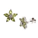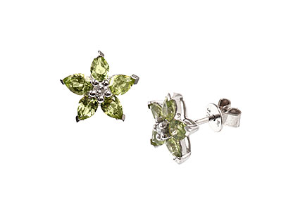 Simply stunning, these beautiful 9ct white gold diamond and peridot stud earrings, are elegant and intricately crafted. The flower shaped white gold cluster settings, have a single round brilliant cut centre diamond, surrounded by five pear shape cool fresh apple green peridots in a claw setting, which creates a dazzling display of sparkling passion.
