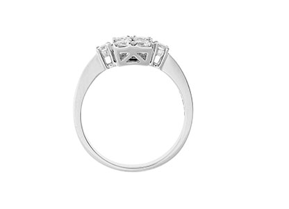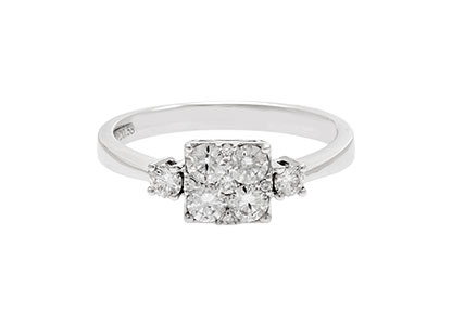 This stunning diamond ring is crafted in 18ct white gold, using the finest materials and methods of jewellery making skills. Set with a total of eleven round brilliant cut diamonds that have been specially chosen for their exceptional sparkle and fire and claw set into a square shaped cluster centre, with a single round brilliant cut diamond to each side which captures and disperses light from every angle.
