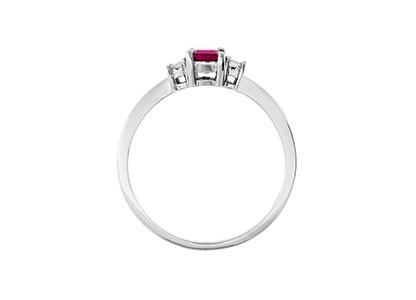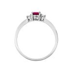 Elegant three-stone ring in 18ct white gold with a step-cut red ruby and baguette diamond sides. Stocked in size M; other sizes available by special order within approximately ten working days.