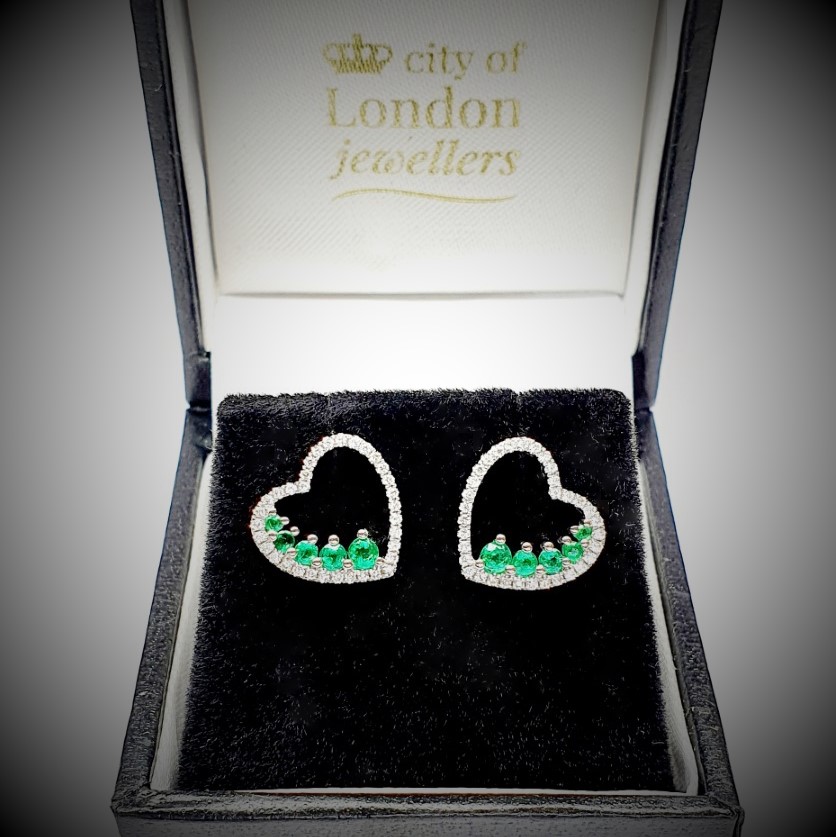 City of London Jewellers present these stunning Killarney Emerald & Diamond Heart Earrings ESA00486.