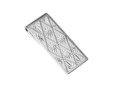 A highly polished 925 realĀ silver money clip, with a Beautifully engraved, swirling star inside a chequered diamond shape design to the front, and a polished back.