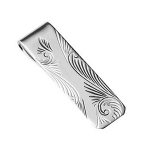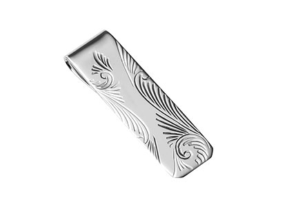 A highly polished 925 realĀ silver money clip with a Beautiful scroll leaf design to front and a plain polished back.