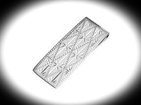 This engraved sterling silver money clip combines polished elegance with everyday practicality. The hallmarked 925 silver design features a striking Star motif framed within a chequered diamond pattern, creating a refined accessory with real character. Its smooth back keeps the silhouette sleek, an ideal gift for any occasion.