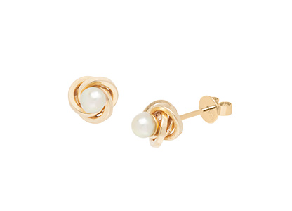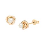 Made from hollow 9ct yellow gold tube fashioned into a lovely petite knot design and set with a 3mm cultured pearl.