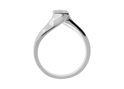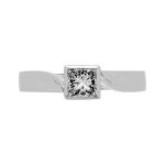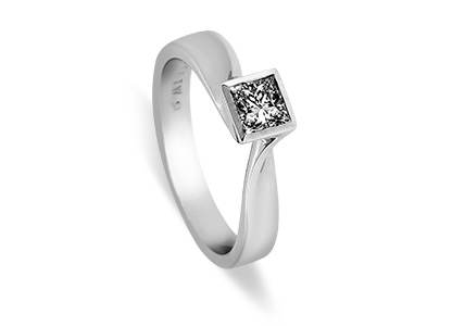 This shapely ring has a smooth snag-free rub-over burnished setting, holding a sparkling princess cut diamond that is set in sturdy luxurious 18ct white gold.