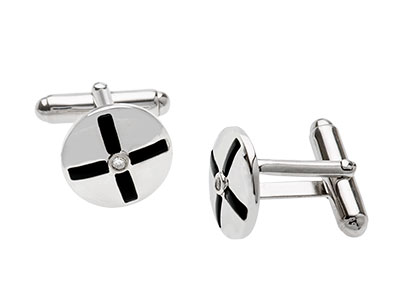 A classic round slightly domed cufflink, with an unusual four sections of black stone inlaid to make a cross design, with a single rub over fluid set round brilliant cut cubic zirconia. A smart addition to any collection.