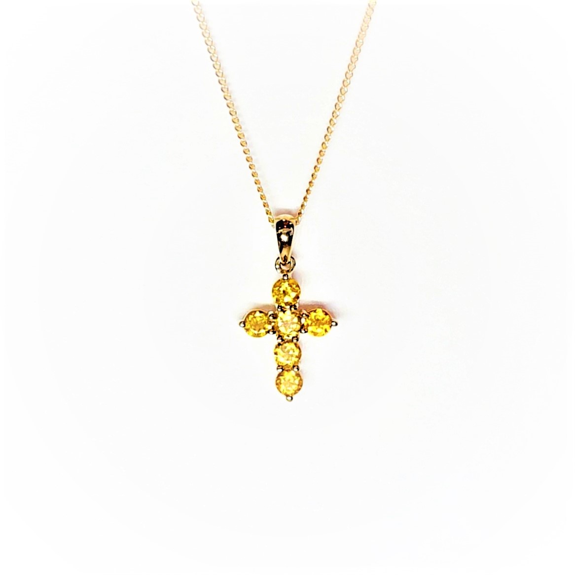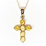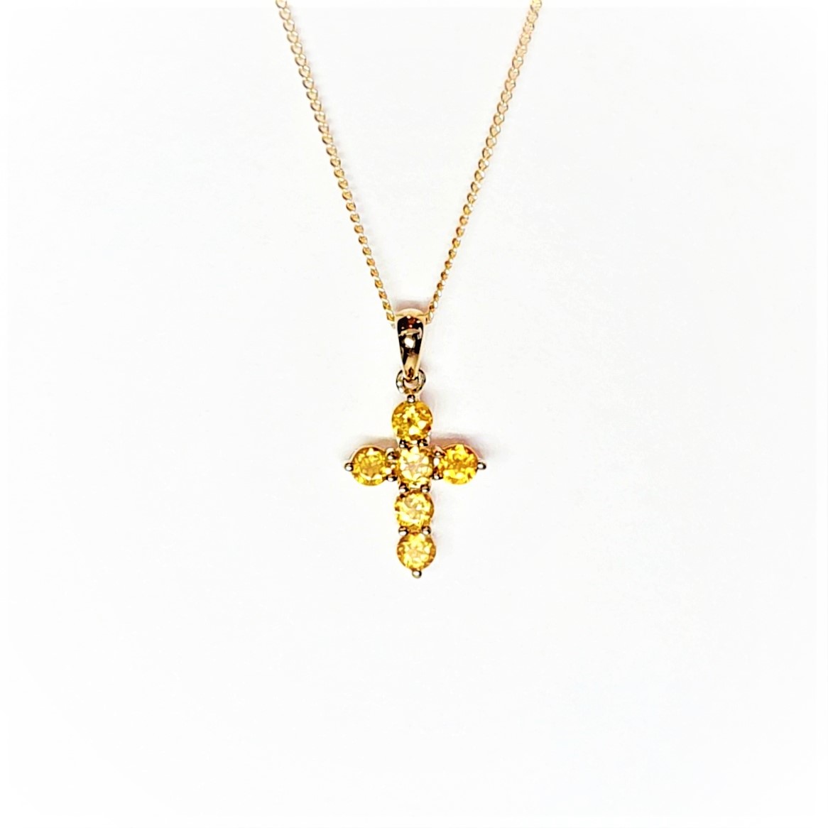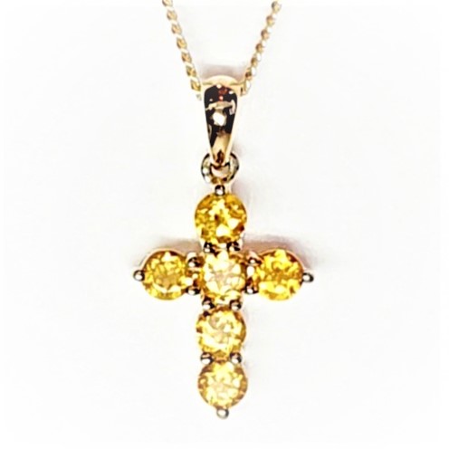 Simply stunning, this beautiful 9ct Yellow gold cross pendant and chain is elegant and intricately crafted. Claw set with six vibrant golden citrine stones, creating a dazzling colourful golden sparkle.