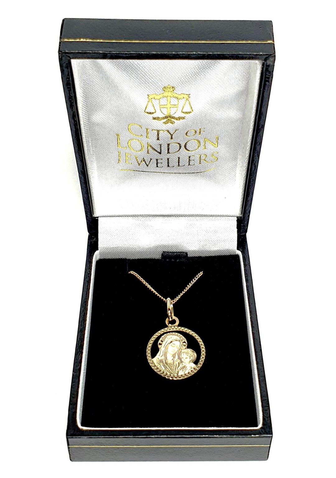 Supplied with a 16-inch/40.64cm or 18-inch/45.72cm 9ct yellow gold curb link chain, it is a perfect gift for a christening or confirmation. The necklace is in a luxurious black leatherette box with a black velvet pad and white silk inner lid, adorned with the City of London Jewellers logo in gold leaf.