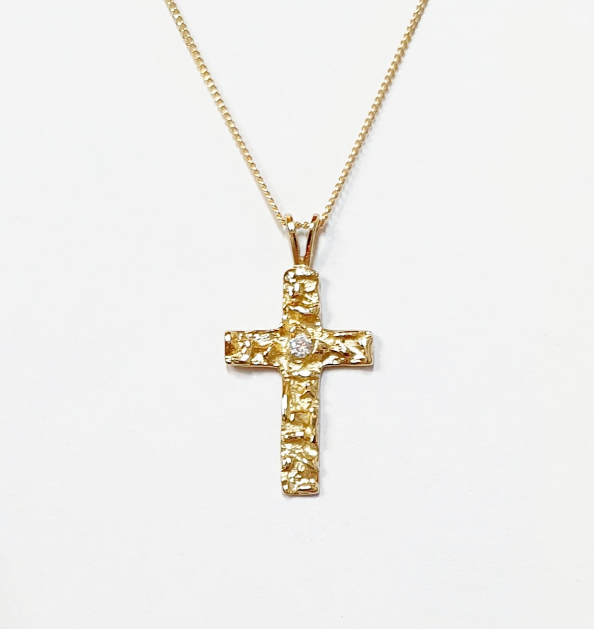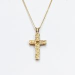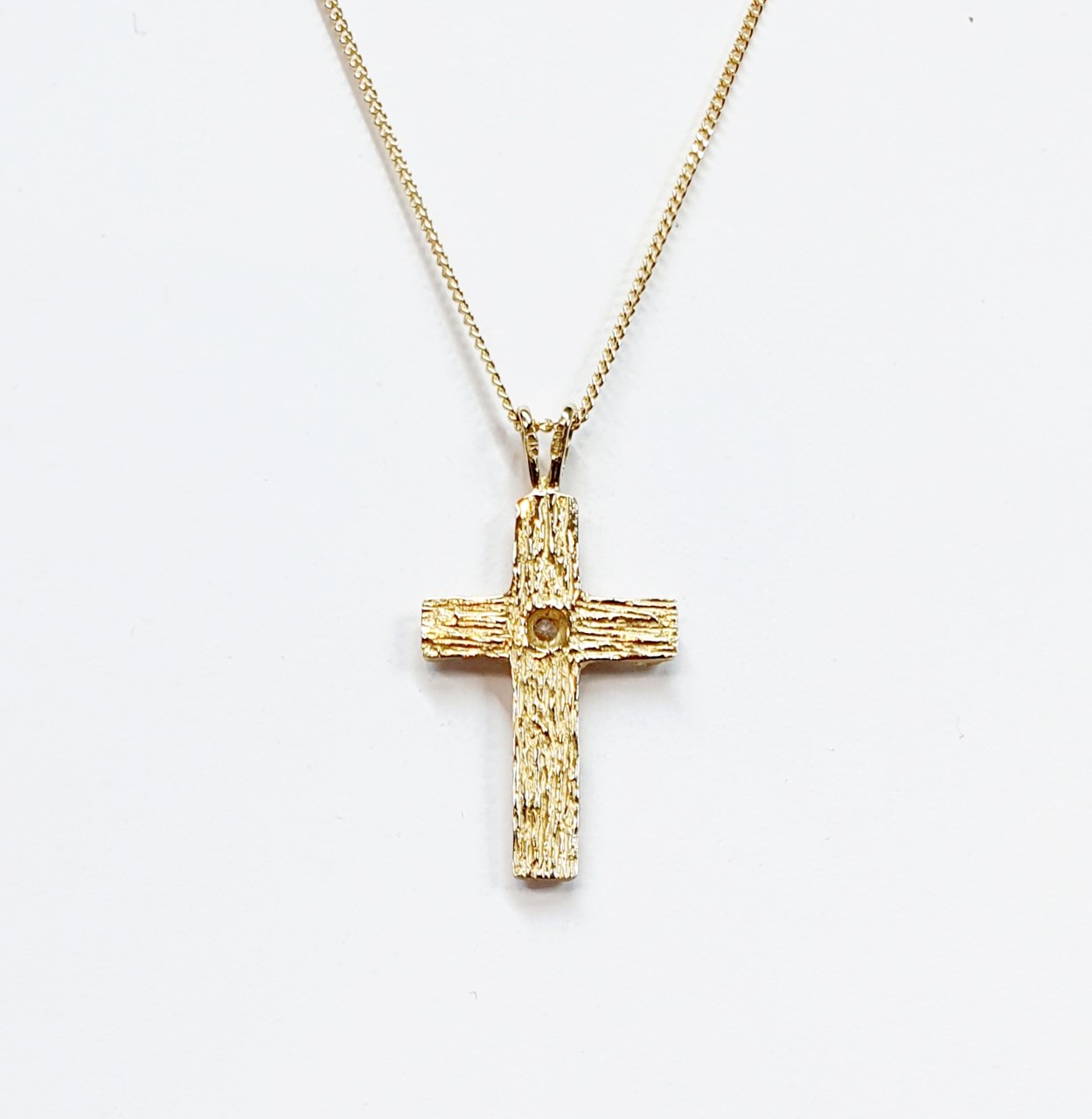 9ct gold cross pendant with hand-engraved tree bark texture.