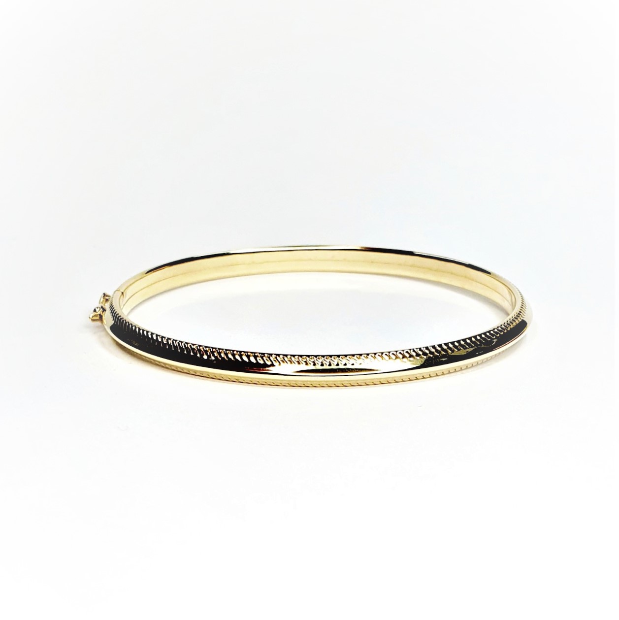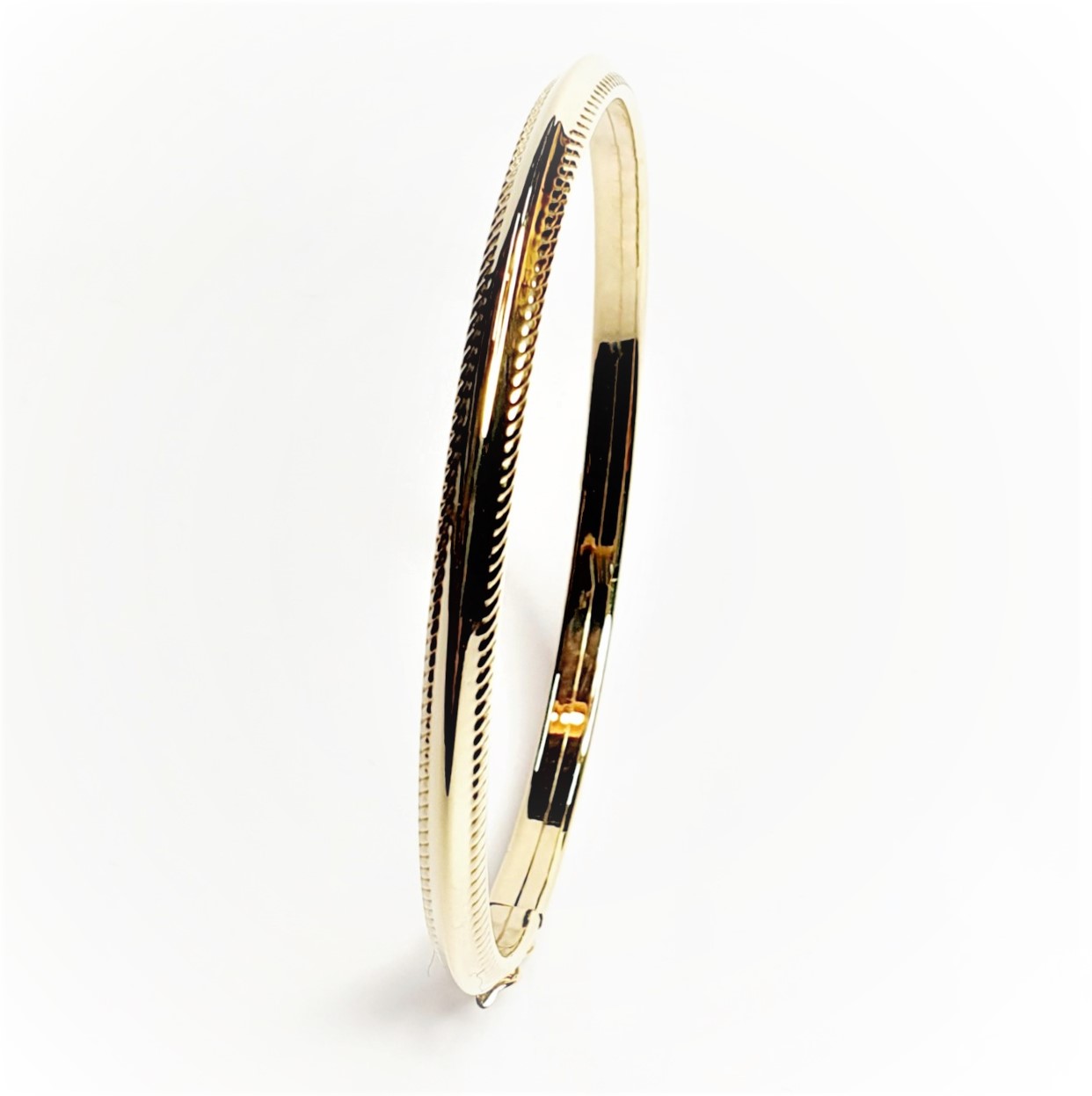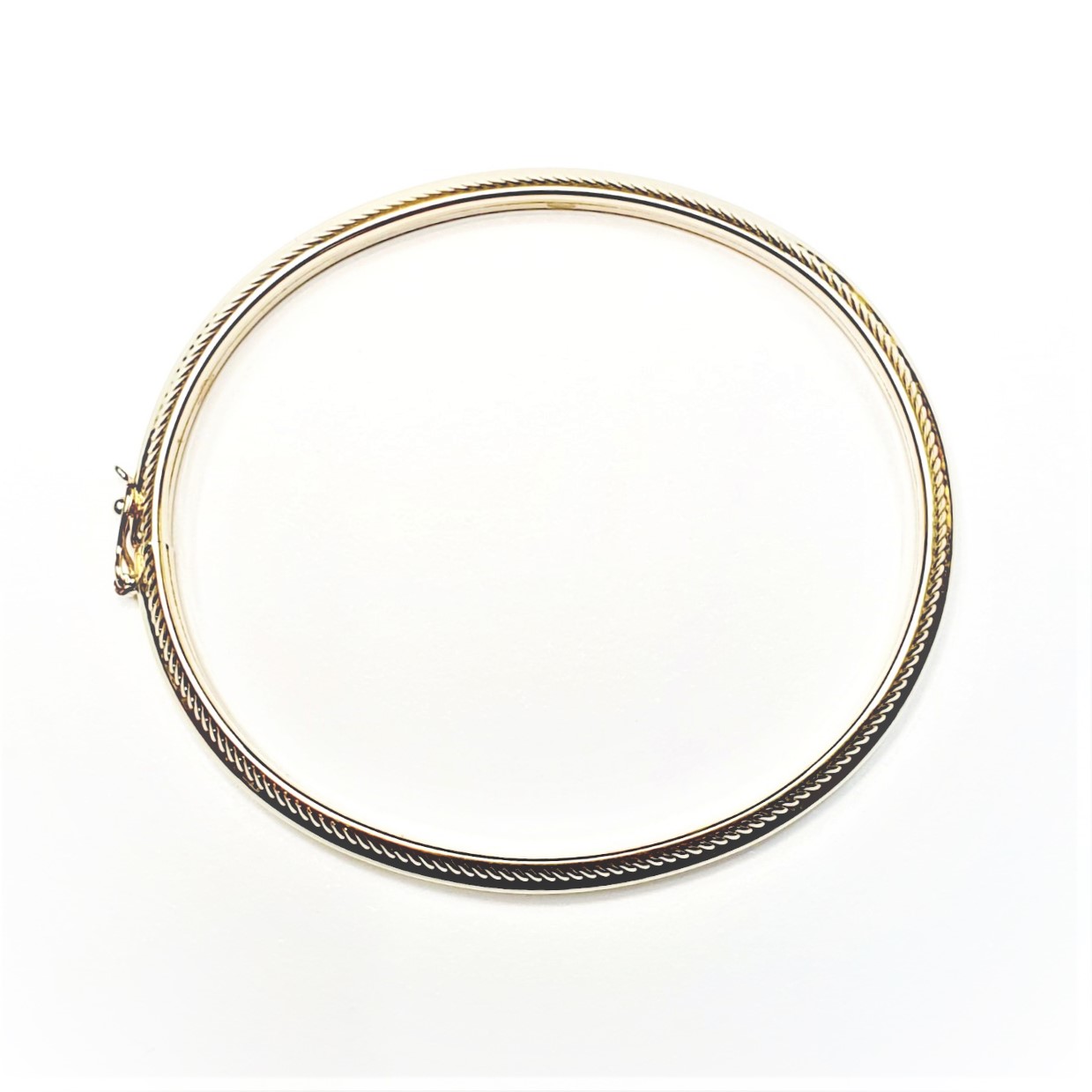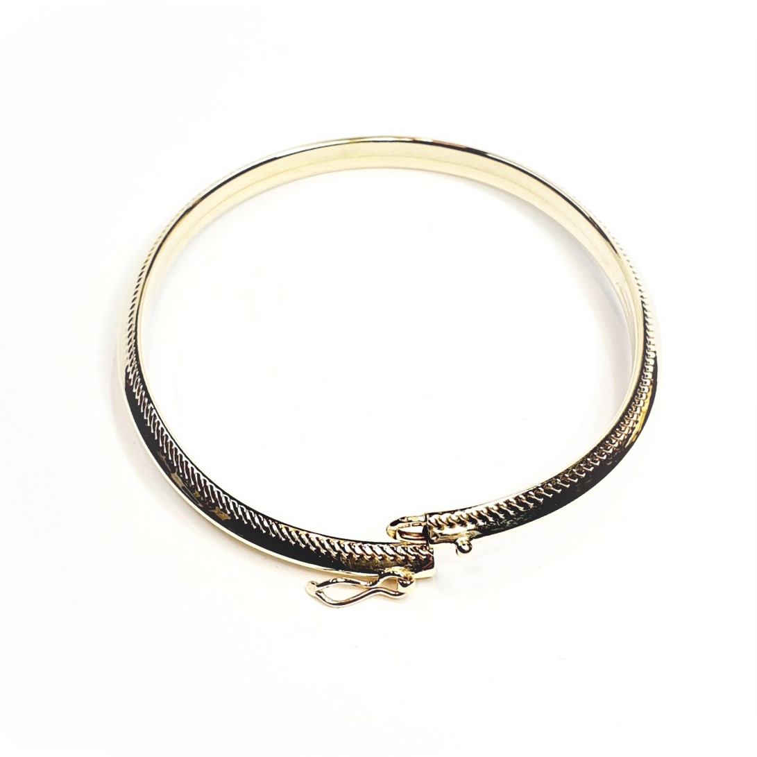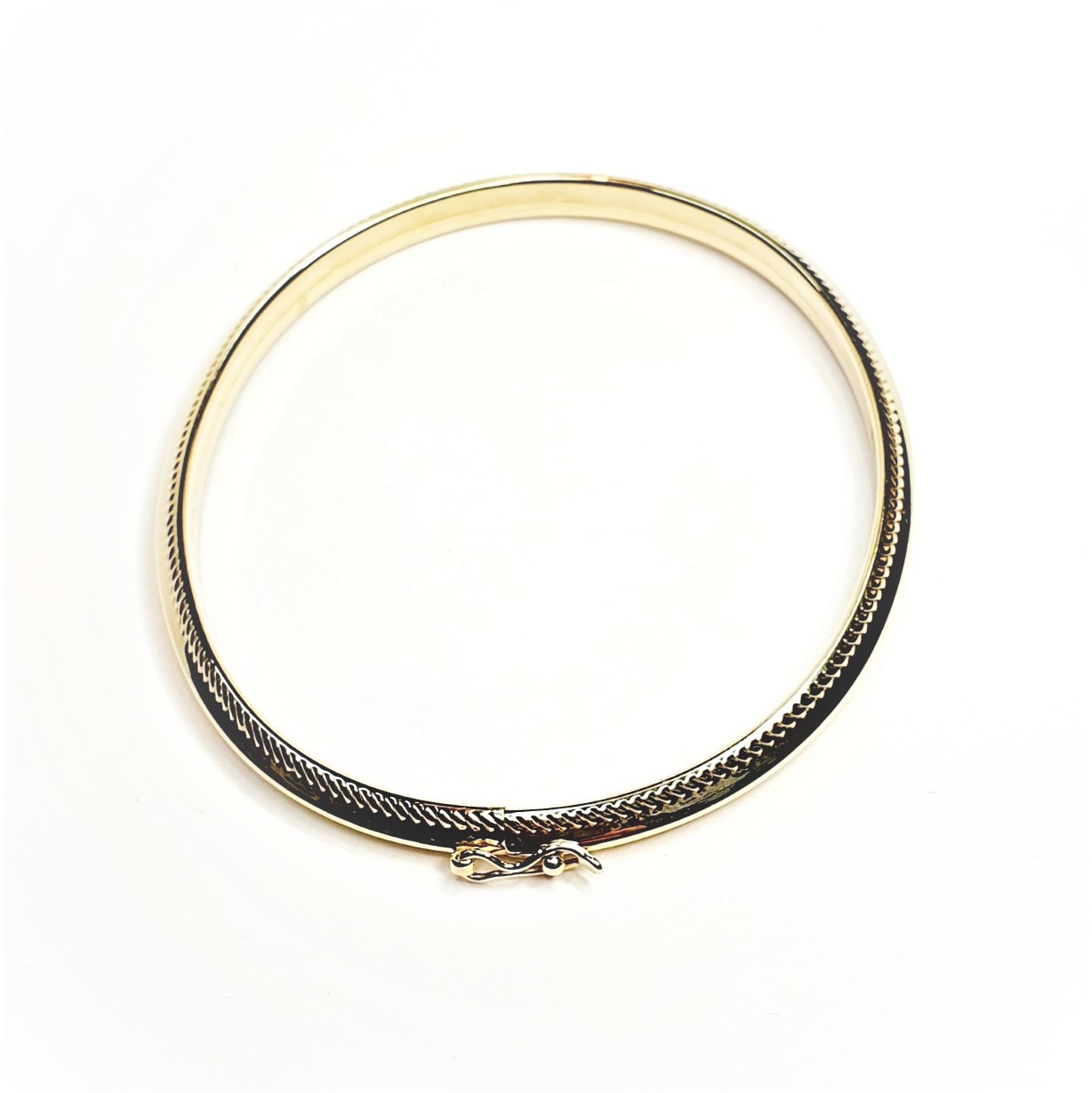 This oval shape bangle is crafted from 9ct yellow gold D shape tube, it opens by gently twisting from side to side to slip over the wrist and has a figure of eight clasp to the top. There is a twisted pattern to the edges and a plain polished finish to the centre .