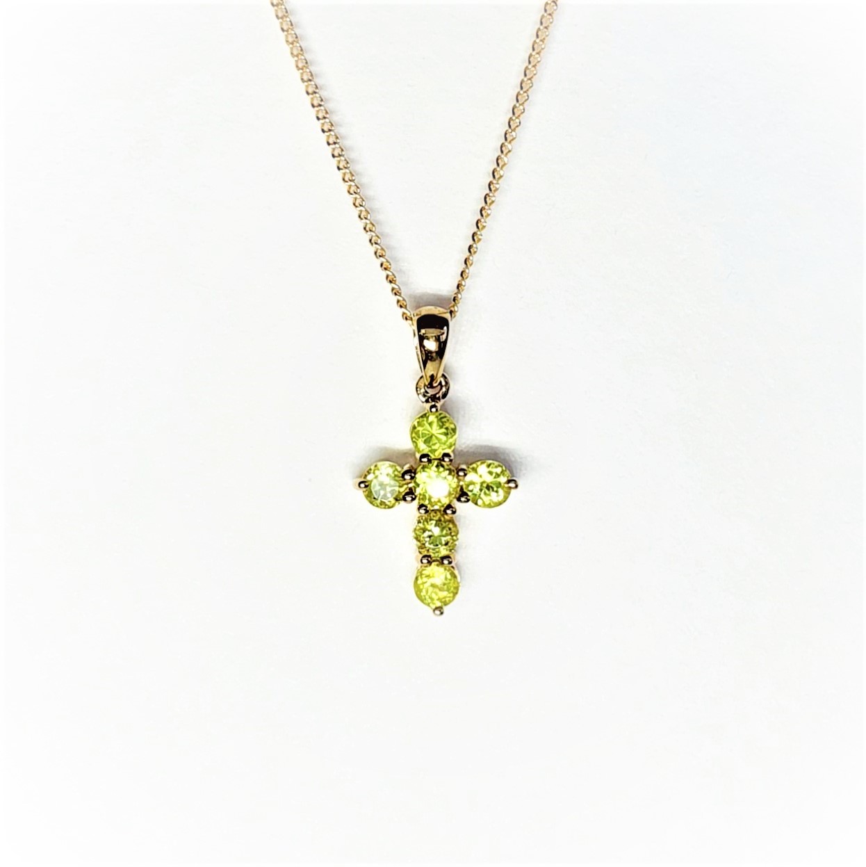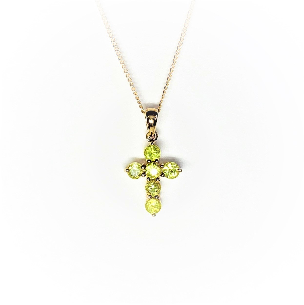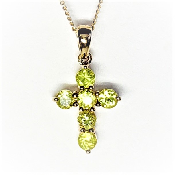 This alluring olivine green Peridot pendant, is set in a gorgeous, highly polished 9ct yellow gold claw setting. The peridot is a natural stone, which makes this cross one of a kind. A cross that will make an unusual colourful addition to your collection.